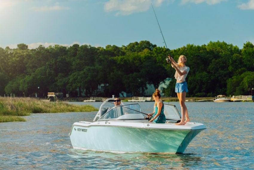 Both of our Dual Family Sportsmans feature rod racks, rod holders, and live wells, which allow for the occasional fishing day combined with the utility of a wrap around windshield and extensive seating. These saltwater friendly runabouts feature comfortable seating up front with a sporty wraparound bench in the cockpit. Watersports enthusiasts will enjoy the built in swim ladder combined with a swinging entry door for easy boarding, and for the occasional fishing trip will find convenient rod holders and even a live well.